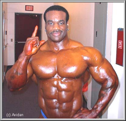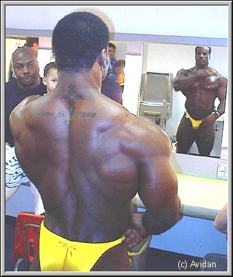 Chris preparing in the dressing room before prejudging, while his son, Kiviok Christopher, look on. Chris was determined to prove all those nayseyers who said his career was over when her got sick and pulled out of the 2000 Mr. Olympia that they were all wrong!