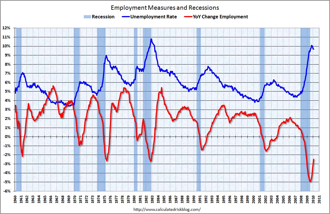 This graph shows the unemployment rate and the year over year change in employment vs. recessions.