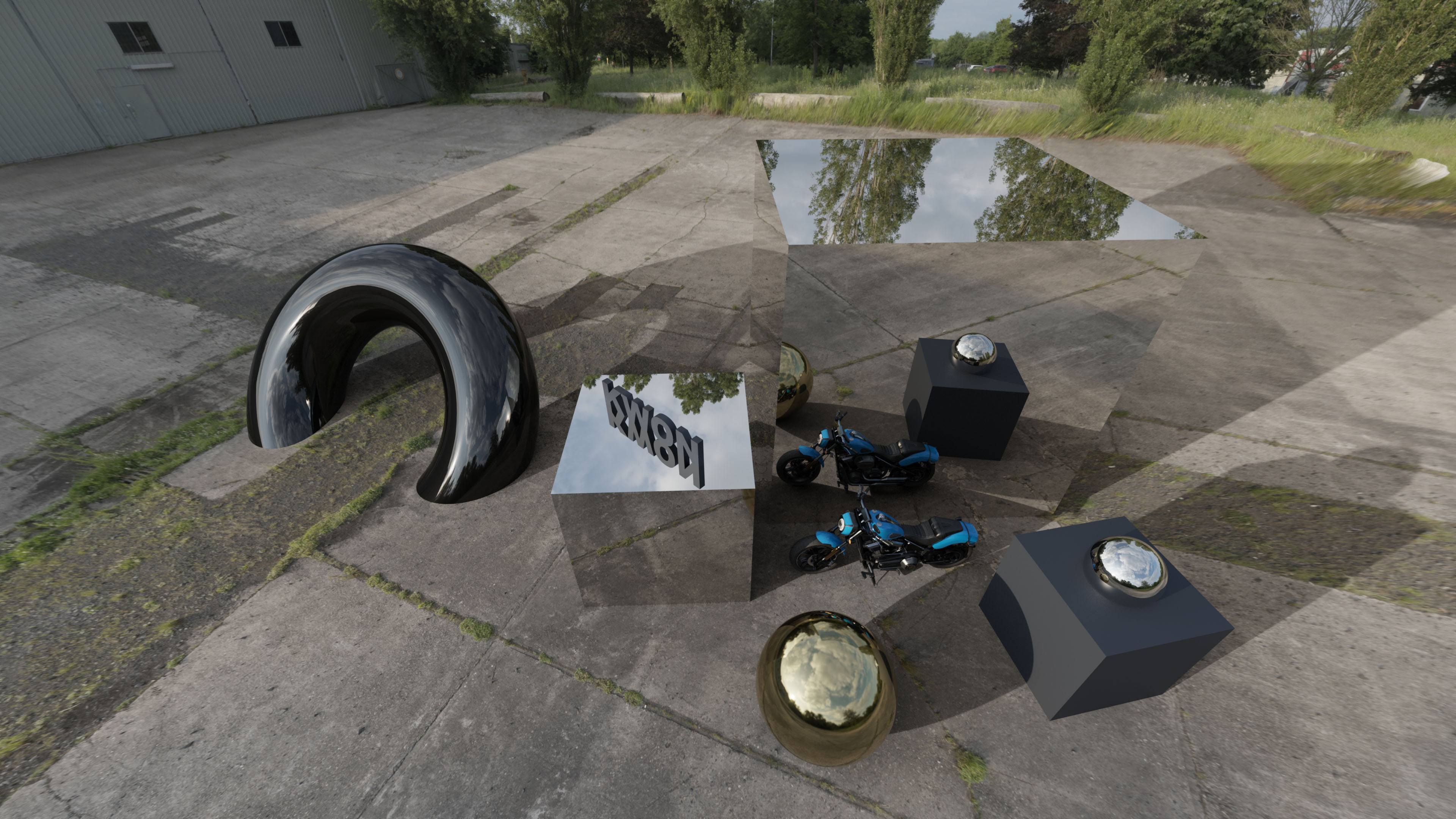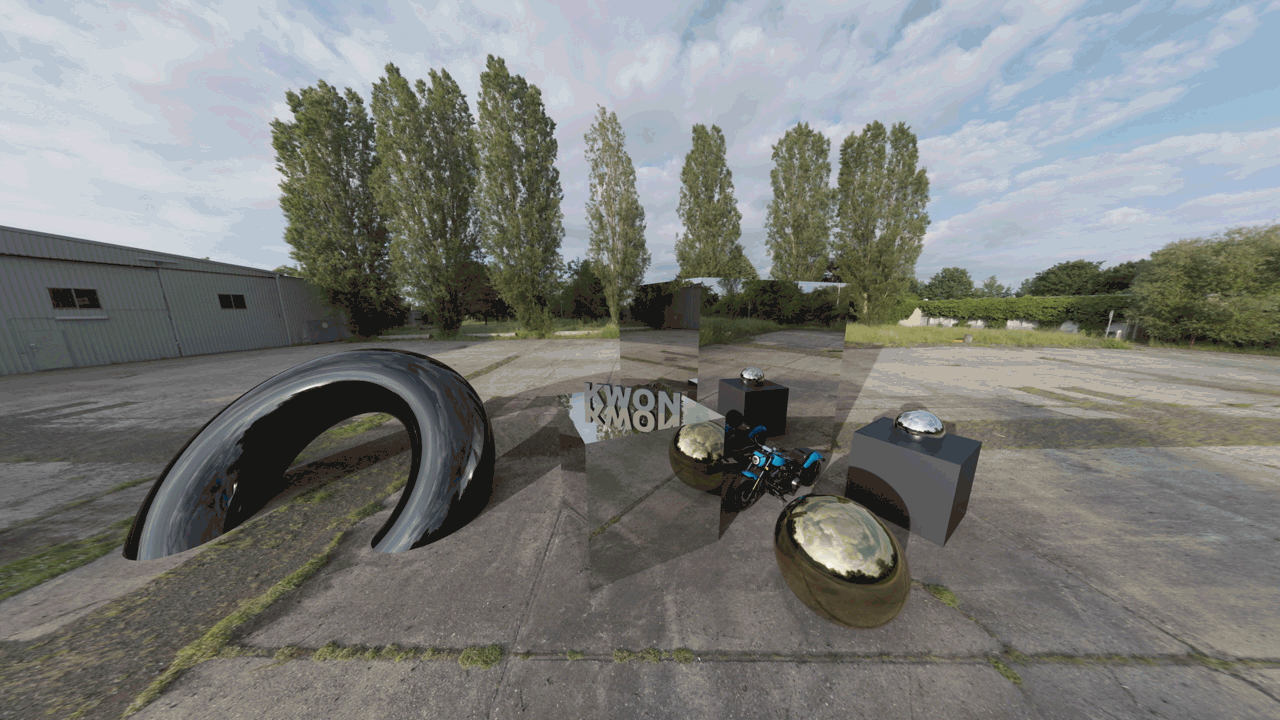 I created several cubes of different sizes — 72", 96", and 24", based on my preference. The spheres have specific dimensions as well. Then I added the road bike to the scene. The torus partially sinks into the ground. Two of the cubes use mirror materials, the gold sphere has a blurry reflection, and the chrome sphere a perfect mirror reflection. The 3D “KWON” lettering sits on one of the cubes.