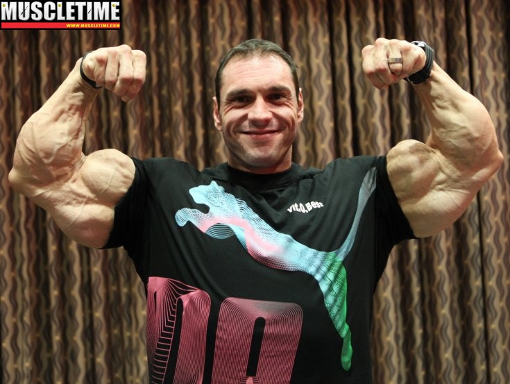 Look at the double bicep pic he has good forearms. In the first pic he is not in competition shape, so you will get fat on your upper arm, but not on your forearms.