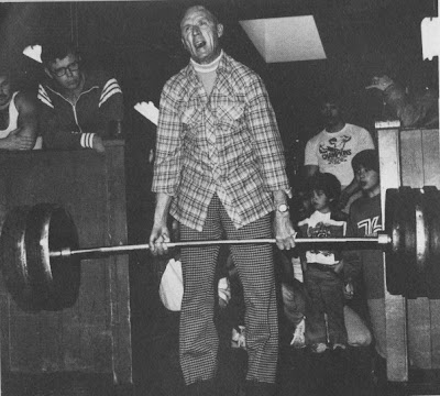 The old dude was a famous powerlifter by the name of Roy Mason, I believe. He got into it late in life, and was a long haul truck driver and preacher, he use to give sermons while he lifted.
