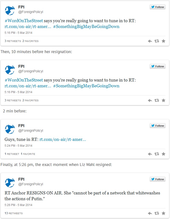 According to the report by TruthDig, much of evidence that Wahl’s resignation was not a spontaneous moment in which she could no longer deal with RT’s “propaganda” can be traced back to Tweets which were sent out about a half hour before Wahl’s final newscast. Though the tweets themselves didn’t come from Wahl, but rather from a neo-conservative think-tank Foreign Policy Initiative, which was started by Bill Kristol.