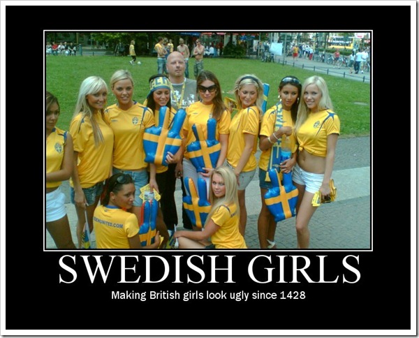 There are a lot different pics depicting how beautiful Swedish girls are, mostly from football events, and I found it kinda odd. There were always pictures of a group Swedish pretty young girls taken at major football events, and Sweden isn't even close being a favorite. Because the players are that handsome?? I would understand if it's Italy, but even they do not have a squad of fan girls following.
