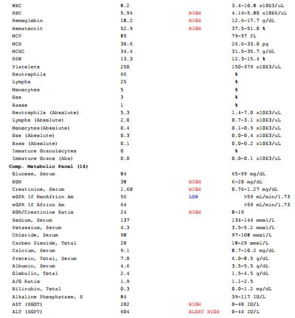 I wouldn't be concerned with the elevations in RBC, Hemoglobin & Hematocrit, as those are merely marginal elevations and since this person just finished a bodybuilding show 5-days prior, it's most likely related to dehydration. Dehydration almost always gives you elevated RBC, Hemoglobin & Hematocrit levels (Think of those three values as particles in a cup of water, the more water you have in the cup, the less you are able to see and quantify the particles AND the less water, the more apparent those particles are) so that's not an issue worth discussing, because as soon as they re-hydrate, those levels will fall within the normal range.