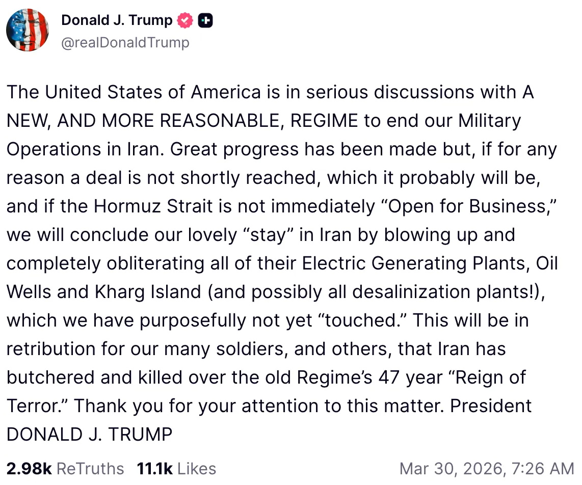 Hey Trump, you do know that intentionally targeting civilian infrastructure—such as power plants and water supplies which are essential for human survival is considered a war crime under international humanitarian law.