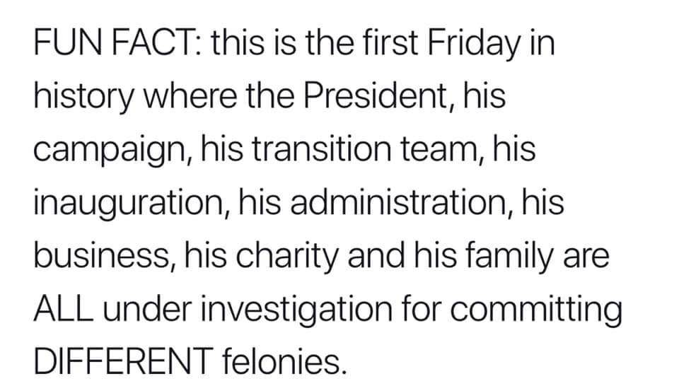 Regarding all the investigations, not surprising at all given he has been under the microscope from the moment he announced he would be running for President, and given all of the bad publicity and negative news about him ever since. This won't stop until he completes his two terms in office.
