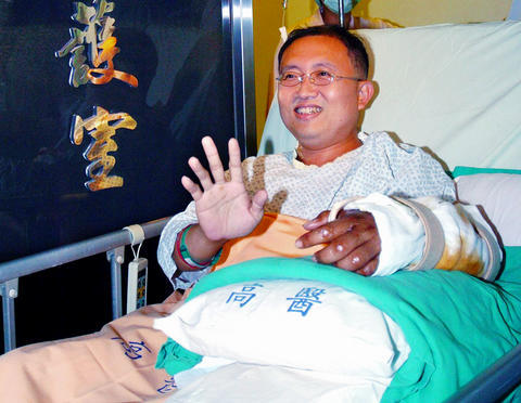 Chang Po-yu, the veterinarian who had his left arm bitten off by a crocodile at Kaohsiung's Shoushan Zoo last month, waves to reporters yesterday as he is transferred from an intensive care unit to a normal hospital bed.