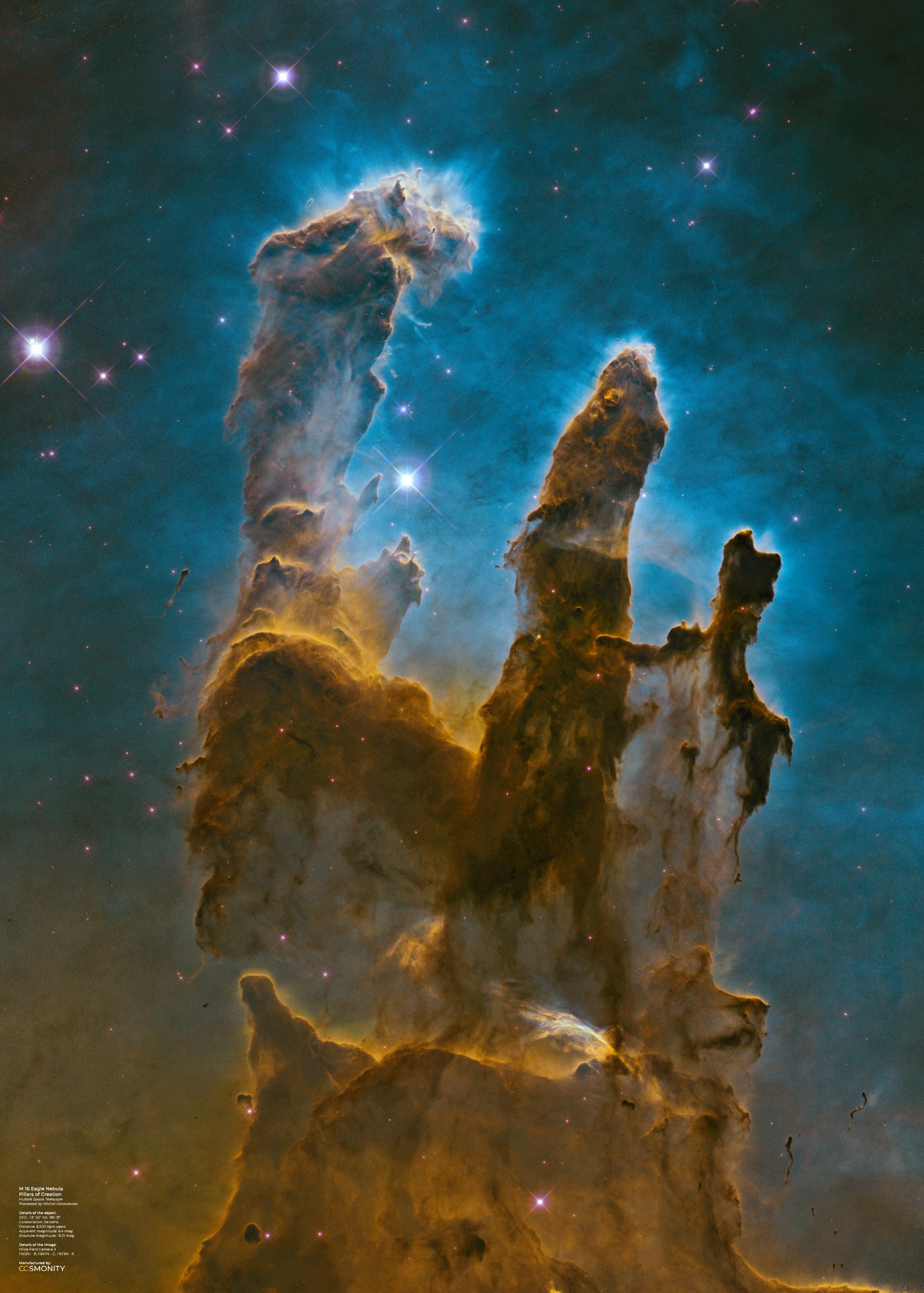 The pillars are composed of cool molecular hydrogen and dust that are being eroded by photoevaporation from the ultraviolet light of relatively close and hot stars. The leftmost pillar is about four light years in length.