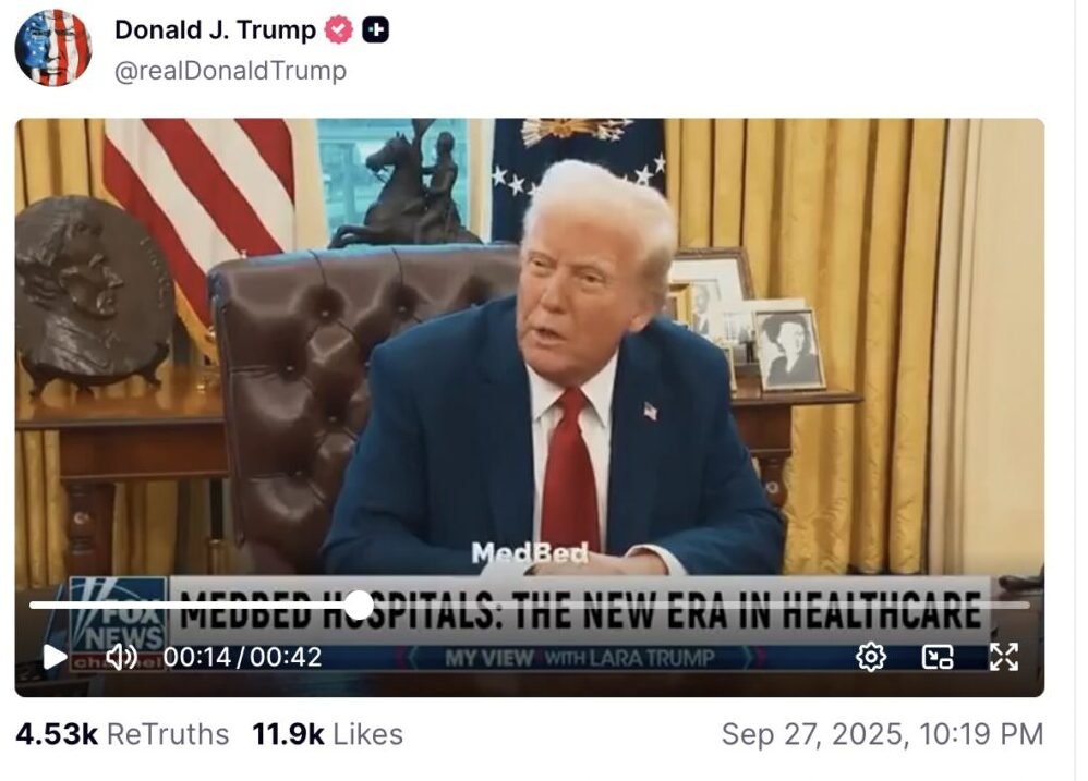 “Every American will soon receive their own medbed card. “With it, you’ll have guaranteed access to our new hospitals led by the top doctors in the nation, equipped with the most advanced technology in the world.” Mr Trump, Truth Social Saturday 27th September