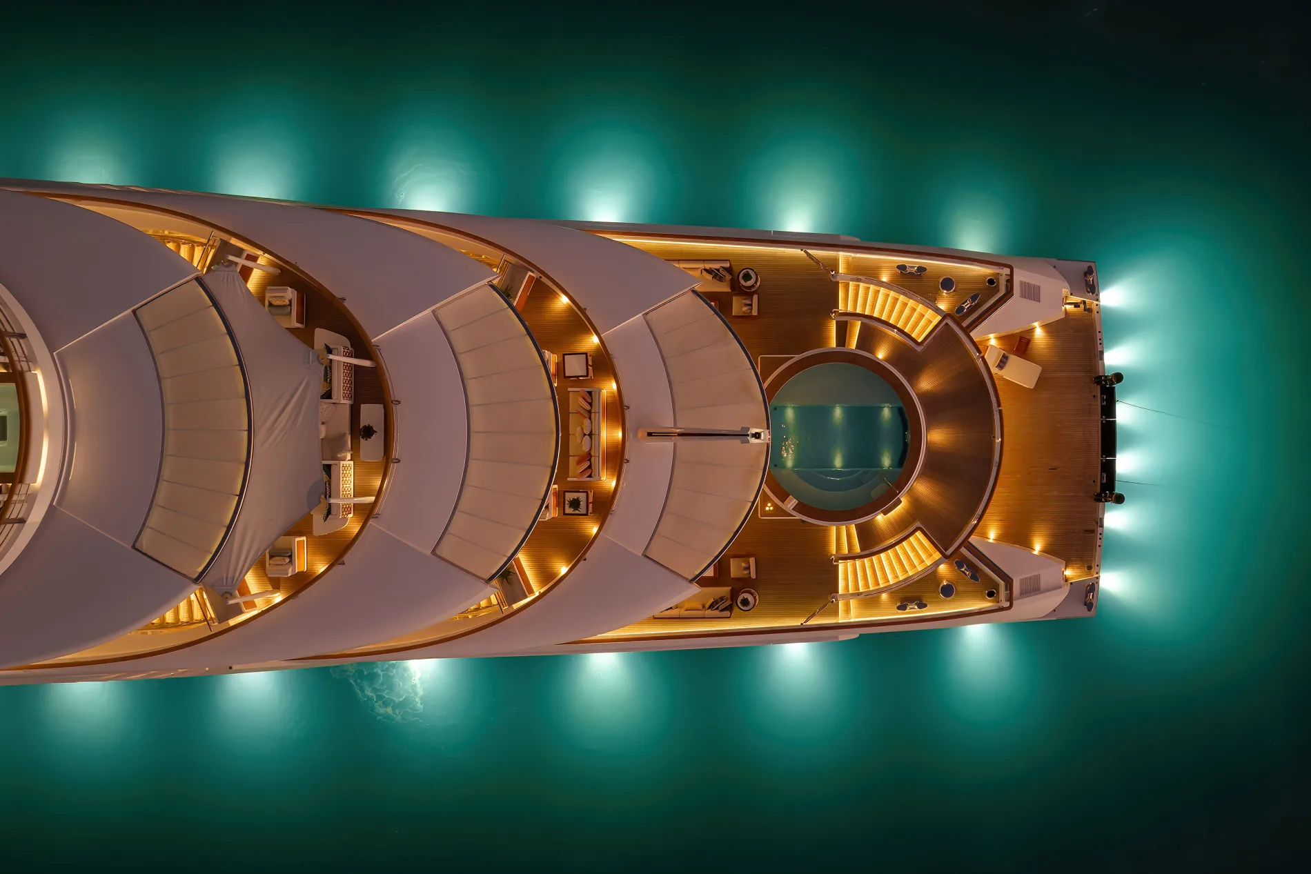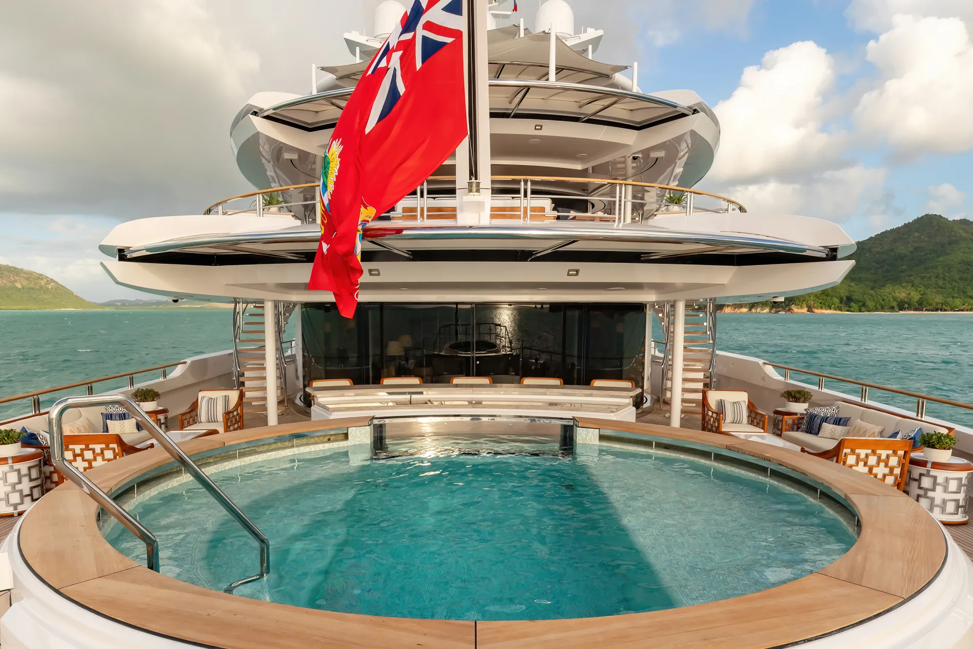 Top view of round small tables next to the pool / large jacuzzi on the main aft deck: