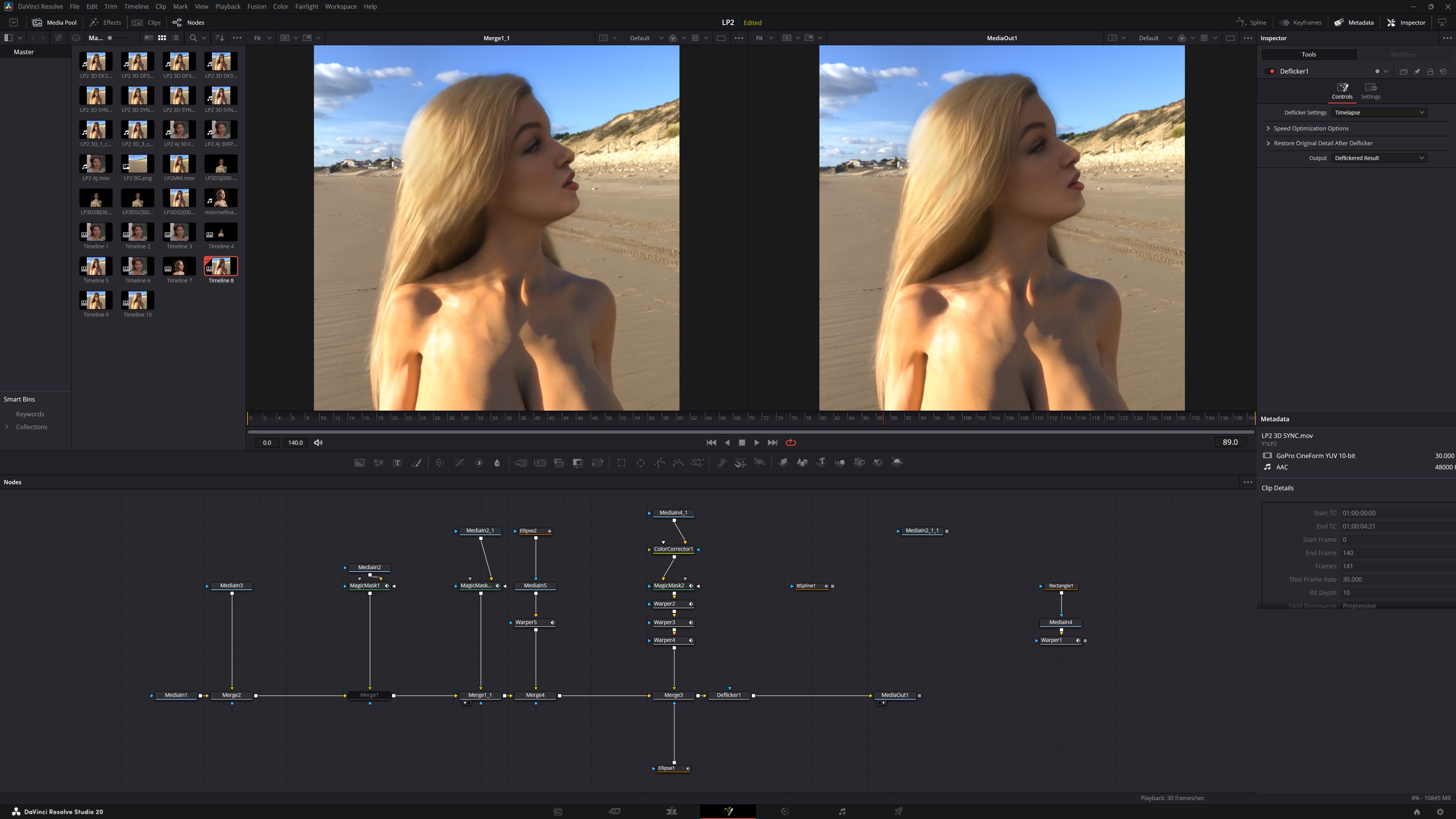 Below is a screenshot of DaVinci Resolve. The clip with the wrong hair is on the left side, and the correction on the right side. I used Adobe Premiere and Adobe After Effects 8-10 year ago. After Effects is still very capable and has editing features that DaVinci lacks. For example the Liquify tool that's also present in Photoshop. Only in After Effects you can liquify a video. But DaVinci has closed the gap and I prefer its node interface. Most people work in the Color Page of DaVinci. I prefer the Fusion Page.