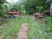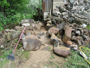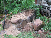 Here are some pictures taken just before the pour. The adjacent fieldstone wall’s lime mortar had completely crumbled, so I tore it down to the ground and rebuilt it dry. That way I could utilize the leftover concrete between the stones. It was useful to have a place to dump the excess, since you never calculate the exact amount of concrete anyway. And I really love the look of a fieldstone wall.
