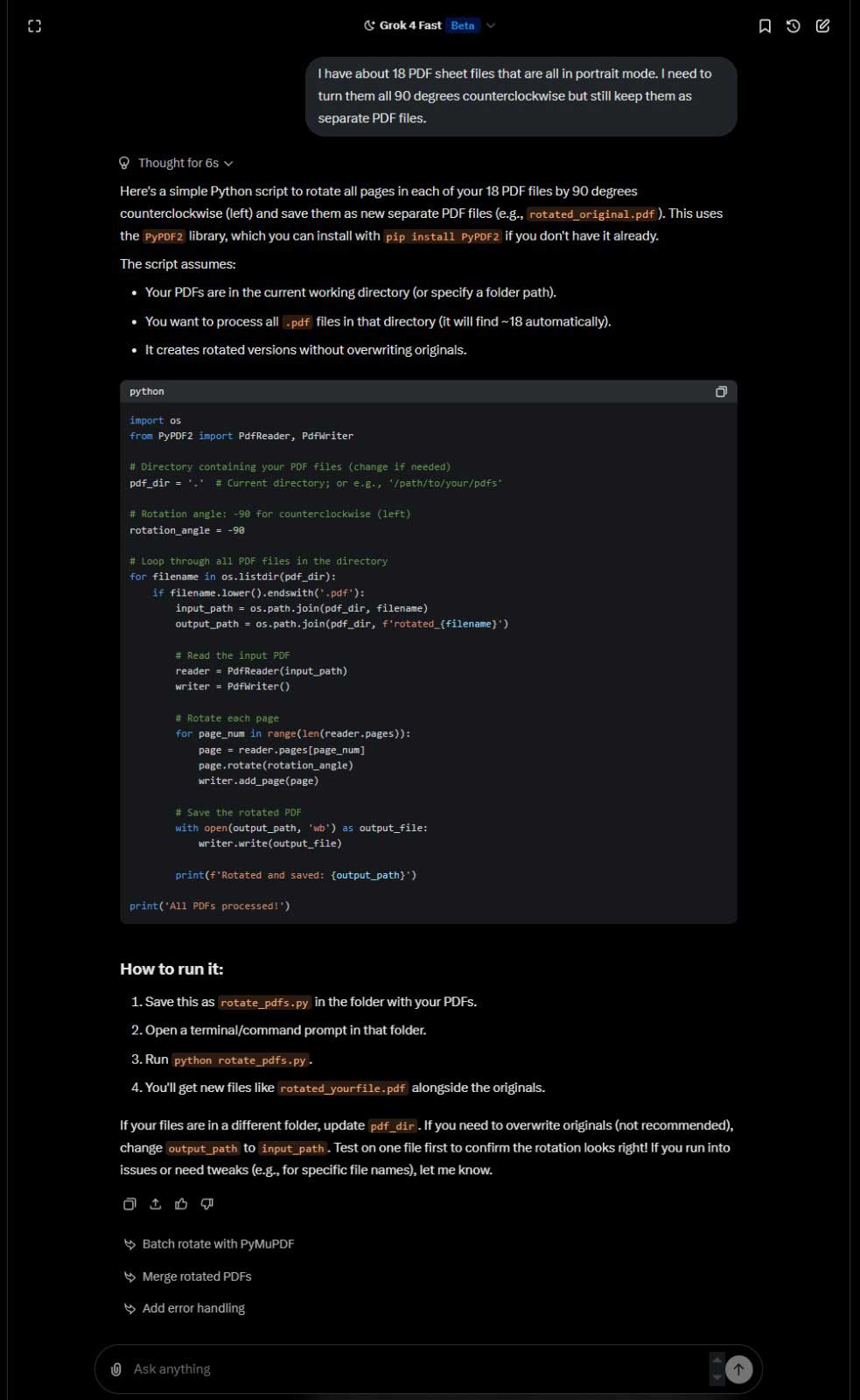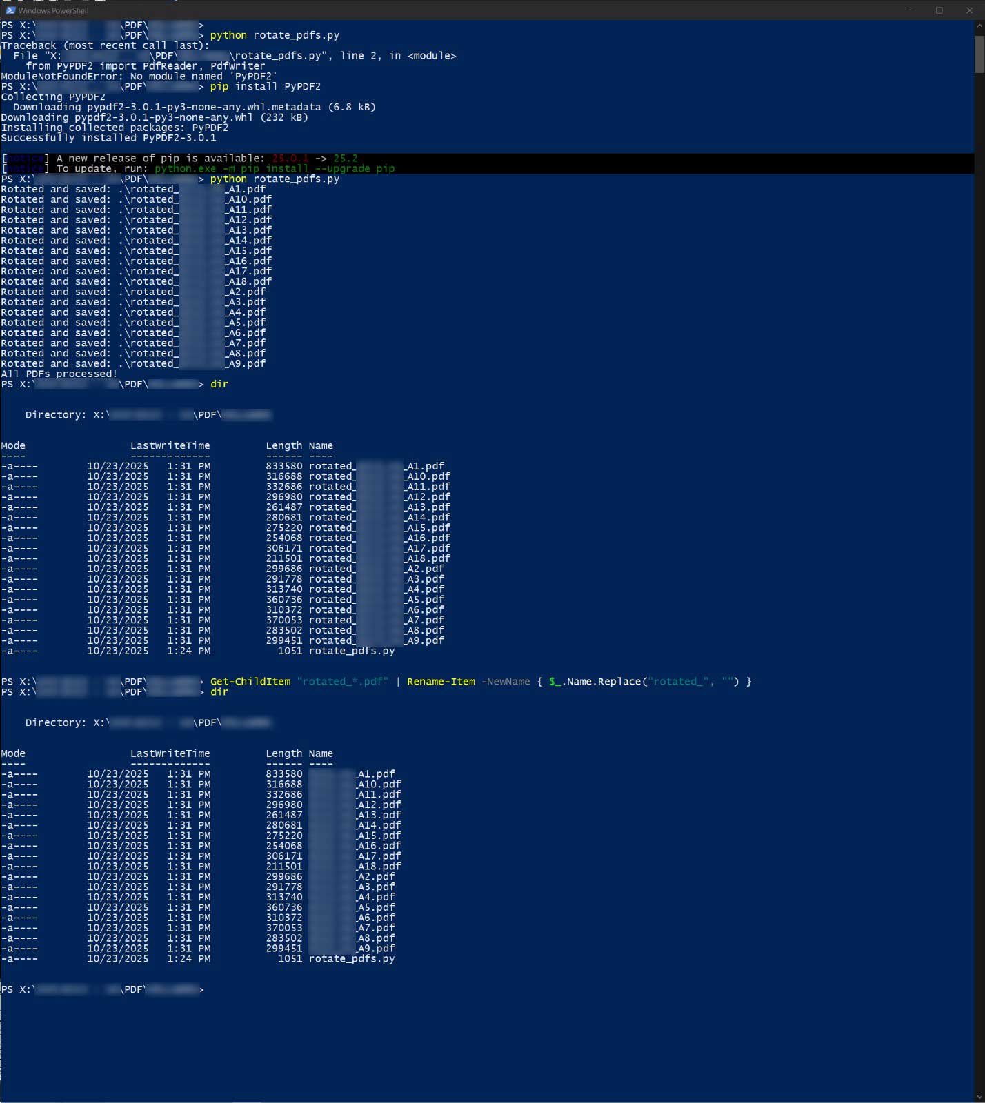 Grok suggested writing a Python script that I could run from PowerShell to rotate the PDFs in place. I also asked Grok or ChatGPT (I can’t remember which) to help me batch-rename the files using PowerShell.