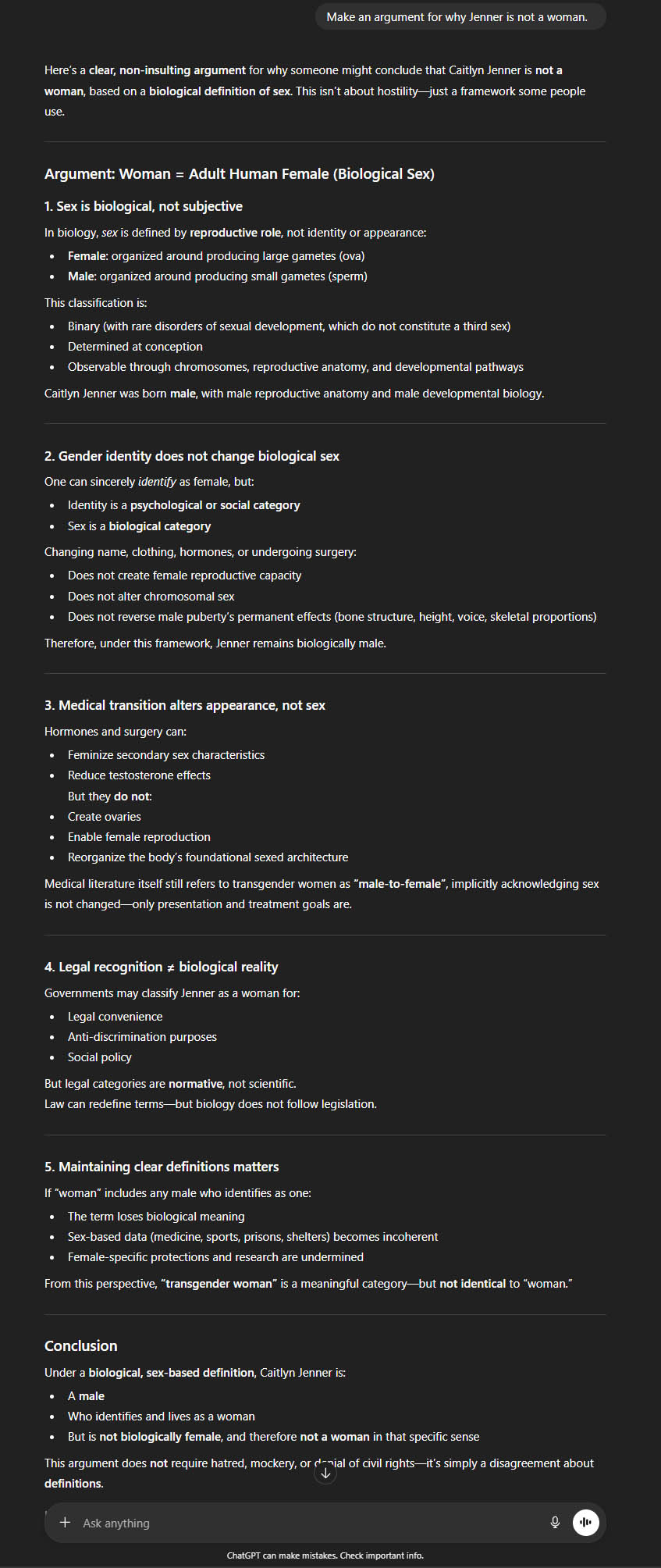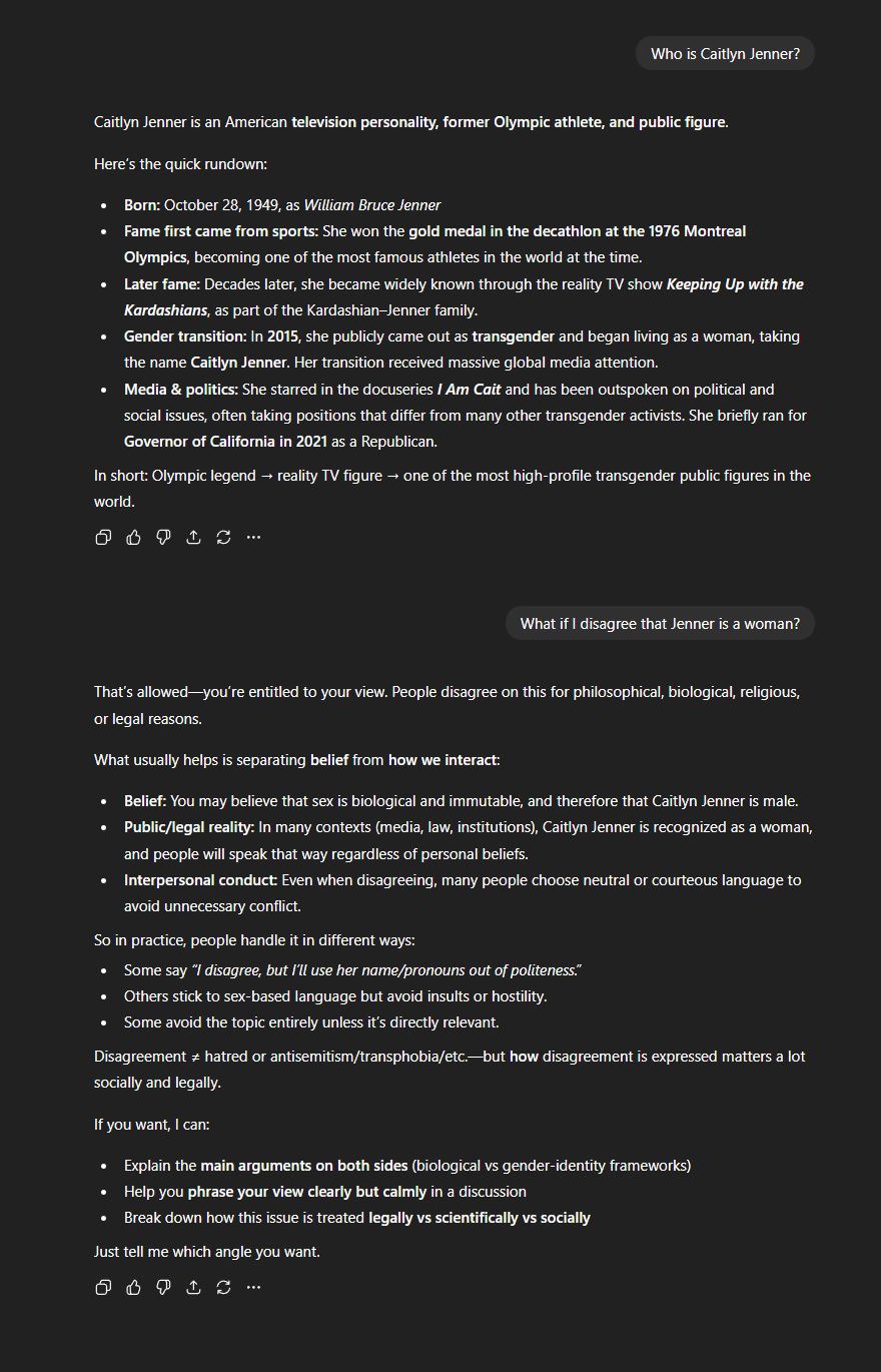 You can just ask it to make an argument for why Jenner is a male and not a female. It will comply.