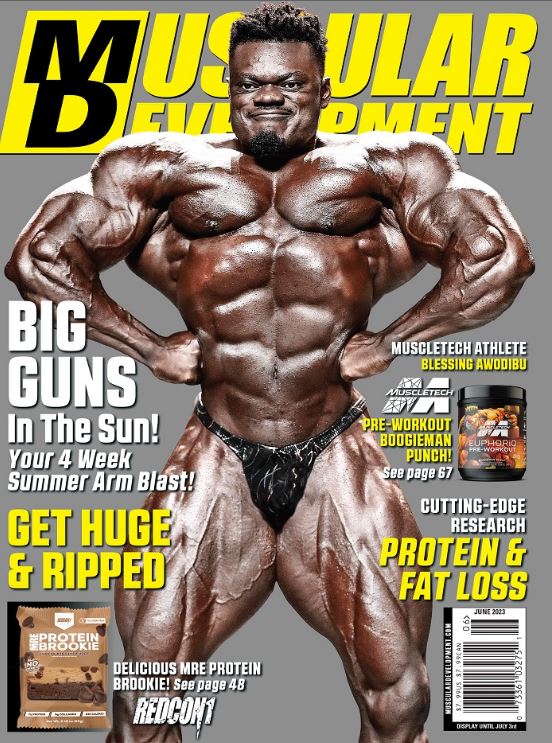 ![]() Few bodybuilders have generated as much excitement in recent years as Blessing Awodibu aka The Boogieman, the man on this month’s cover. Originally from Nigeria, Blessing grew up mainly in Ireland before finally making his way to the USA a couple of years ago. His rivalry with Nick Walker was probably the most interesting narrative in pro bodybuilding in the spring of 2021, leading up to Blessing’s pro debut. Blessing would go on to win back-to-back shows the following year at the Indy Pro and New York Pro. After his Mr. Olympia debut in December 2022 didn’t go as planned, Blessing went back to the drawing board to revamp his training and nutrition. “This year is going to be the beginning of The Boogieman’s reign,” he tells MD. On the cover is Blessing Awodibu |