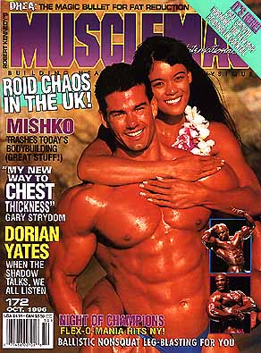 October features an interview with Dorian Yates, as well as Gary Strydom's stupid chest tricks. Other articles include the FIBO from Germany, Oral Growth Hormone (rhGH), DHEA, and Mishko (Milos Sarcev) talking about bodybuilding. This month cover features Bill Davey and Dawn Parado.