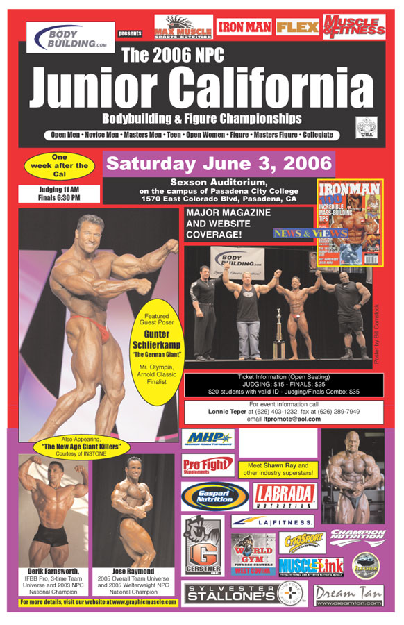 Teper, the most renowned emcee in bodybuilding (he has hosted 60 professional contests and 175 top amateur events over the past 18 years, including this year's Iron Man Pro at the Pasadena Civic Auditorium and the Arnold Classic in Columbus, Ohio) also noted that the contest is the only one in Southern California that still includes a Teenage division, and is the only competition in the country that features a Collegiate Division, which is open to any enrolled or registered student in the academic year, 2006.