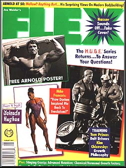 The August issue of Flex Magazine features the H.U.G.E. series returning to the magazine, while also featuring articles involving Tom Prince, Dorian Yates, and Mike Francois. Also, the last part of the East German Doping system, which is very interesting reading. Yolanda Hughes is the star in the Power & Sizzle section.