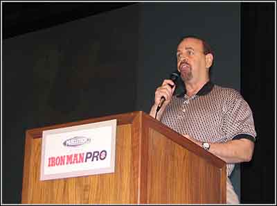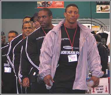 Lonnie weighs himself, the scale showing 199 pounds, 20 pounds less than he was at last year's press conference.