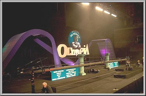 Setting up the Olympia contest stage.