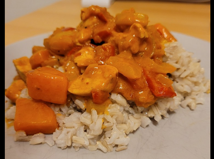 Chicken, red curry, mixed vegetables, sweet potato, onions and brown rice.