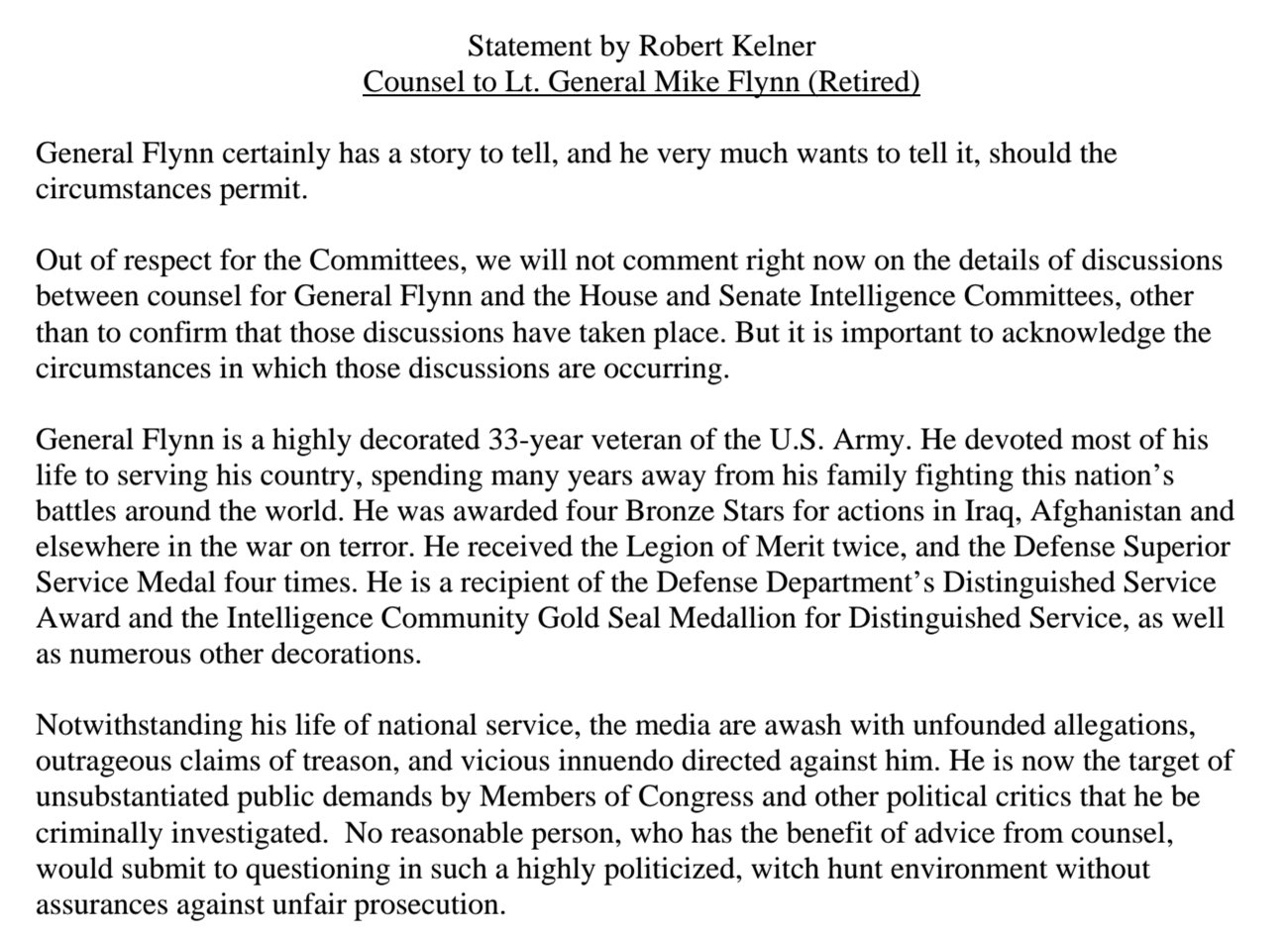 Statement from Flynn's lawyer acknowledging discussions w/ House and Senate Intel Committees, no mention of FBI.