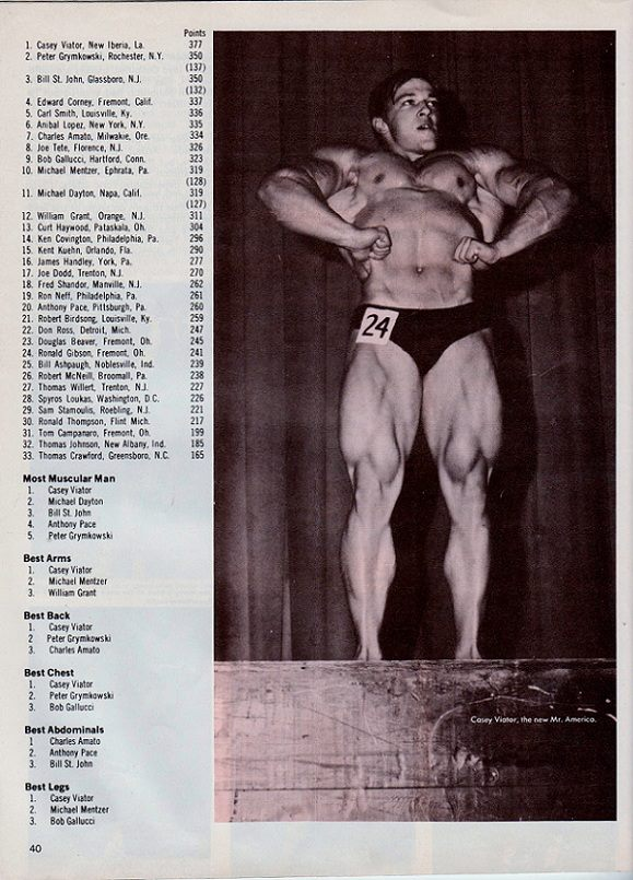 Of course the line-up of contestants this year was one of the best, and certainly one of the largest groups in recent years to assemble, though several failed to put in their appearance at the last minute. Unfortunately, Ken Waller, one of the formidable contenders, was disqualified on the grounds that he allowed his picture, knowingly or unknowingly, to appear in a commercial advertisement circulated in a widely distributed magazine. At a special meeting that morning a final vote was taken on the issue, with only two votes given in his favor, while five opposed him. Naturally, this eliminated him from the competition and Casey had it all his way. If Ken Waller was eligible there would have been a much closer battle for the top honors, since Waller is bigger and heavier and apparently was in top shape, against the shorter but more massive Casey Viator. Of course reaching a decision under those circumstances would have given quite a headache to the judges, and the results might have been different than they turned out. At least it's something to speculate about. However, even as things turned out, a tie for second place resulted between Peter Grymkowski and the perennial Bill St. John. On the second voting ballot, Grymkowski scored 137 points over St. John with 132 points, putting Grymkowski ahead of St. John in the contest. However, another tie for 10th place was also broken by a second ballot. In this case the relatively new-comer, Mike Mentzer, forged ahead of Mike Dayton by one point, 128 to 127. But the overall competition was excellent, and most of the contestants looked really great under the lights.