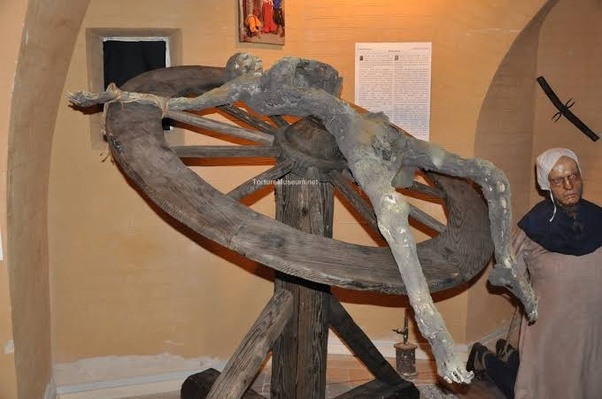 The breaking wheel, also known as the Catherine wheel, a torture and execution device used in Europe from the Middle Ages into the early modern period.  It was primarily used for public execution by shattering the limbs of the condemned using an iron bar before they were woven into the wheel for display. The device served as a brutal form of capital punishment, designed to prolong death and act as a public spectacle to instill fear.  This form of punishment was abolished in various European regions during the 19th century, with the last known execution by wheel occurring in 1841.