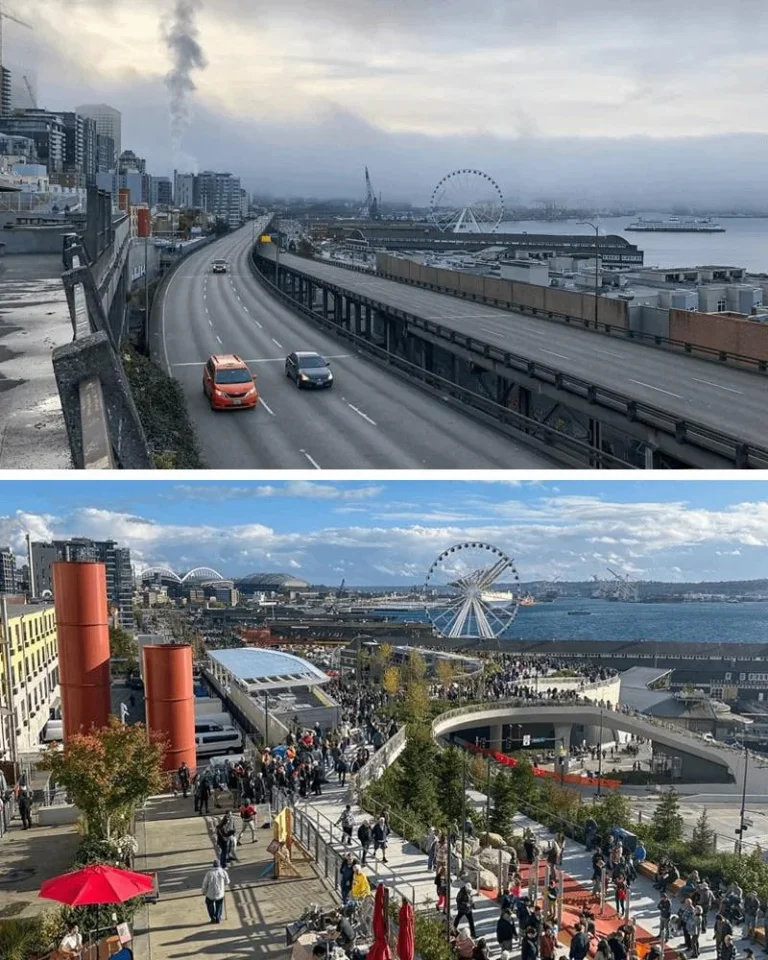 Seattle before and after removing the Alaskan Way Viaduct in 2020.