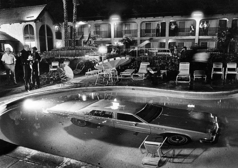 A car that was driven into a motel pool, the driver was arrested “on suspicion of driving while intoxicated”, Costa Mesa, California, March 18, 1984