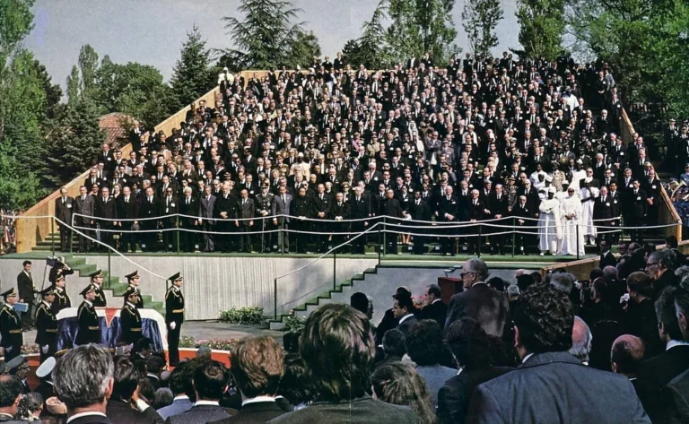 The state funeral of Josip Broz Tito, the President of Yugoslavia, held in Belgrade on May 8, 1980.  With 4 kings, 31 presidents, 6 princes, 22 prime ministers, and 47 ministers of foreign affairs present, some consider Tito’s funeral the largest state funeral in history.