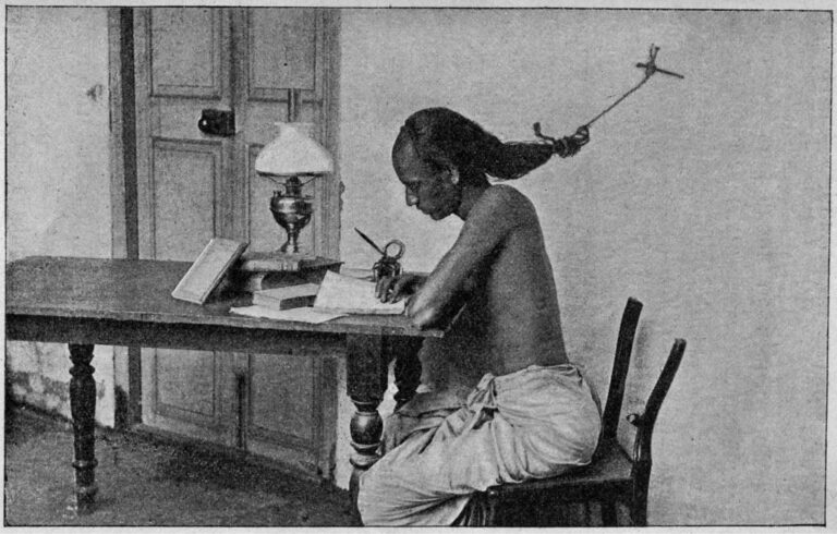 University of Madras student ties his hair to a nail to prevent sleeping at night while preparing for exams, 1905.  Education during this era in colonial India was demanding, with limited access and high pressure to excel.