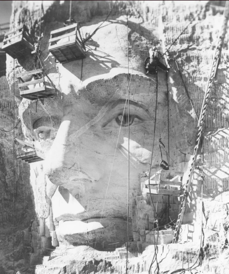 Lincolns head being cut into mount Rushmore, 1937