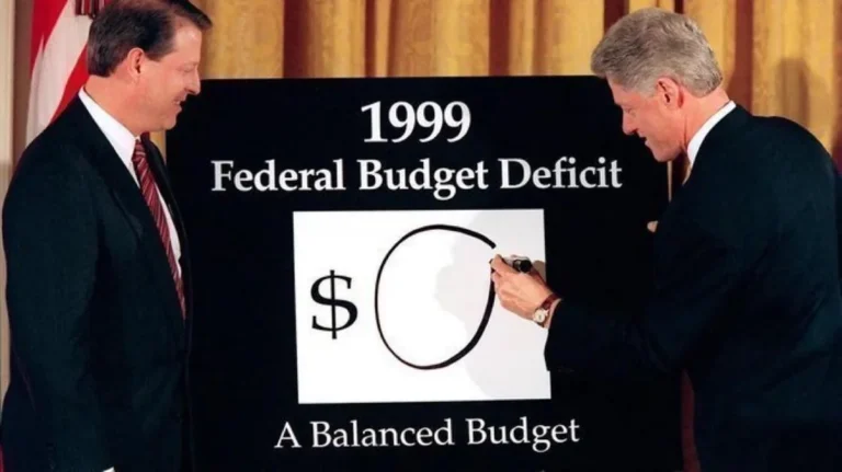 President Bill Clinton draws a giant zero on a sign as he and Vice President Al Gore unveil the balanced federal budget in the White House