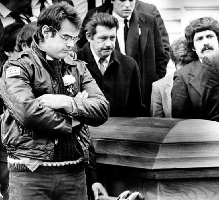 Front pallbearer Dan Aykroyd pausing with his arms crossed over the coffin of John Belushi following services at West Tisbury Congregational Church on Martha’s Vineyard, March 10th, 1982.