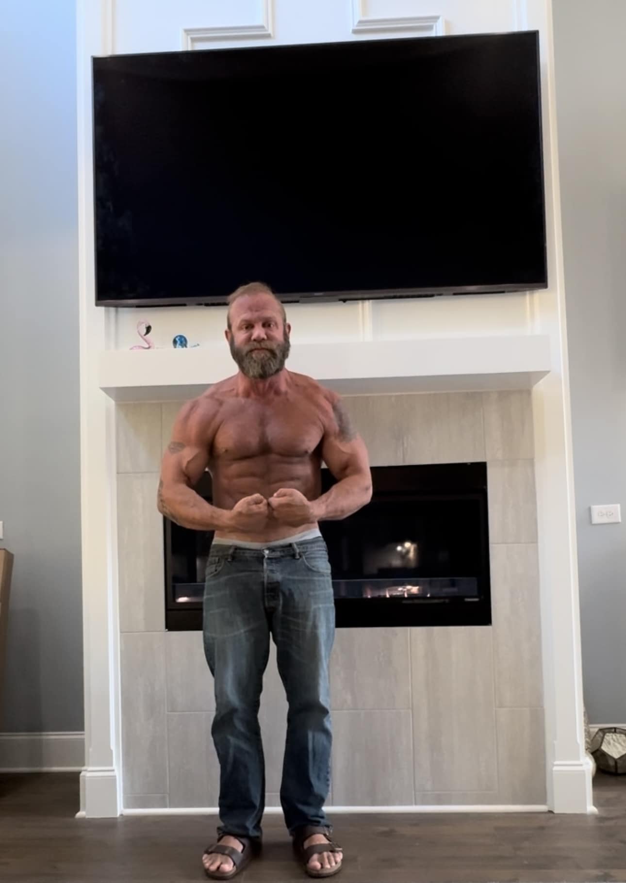 Obviously proud of his new flat screen, good for him