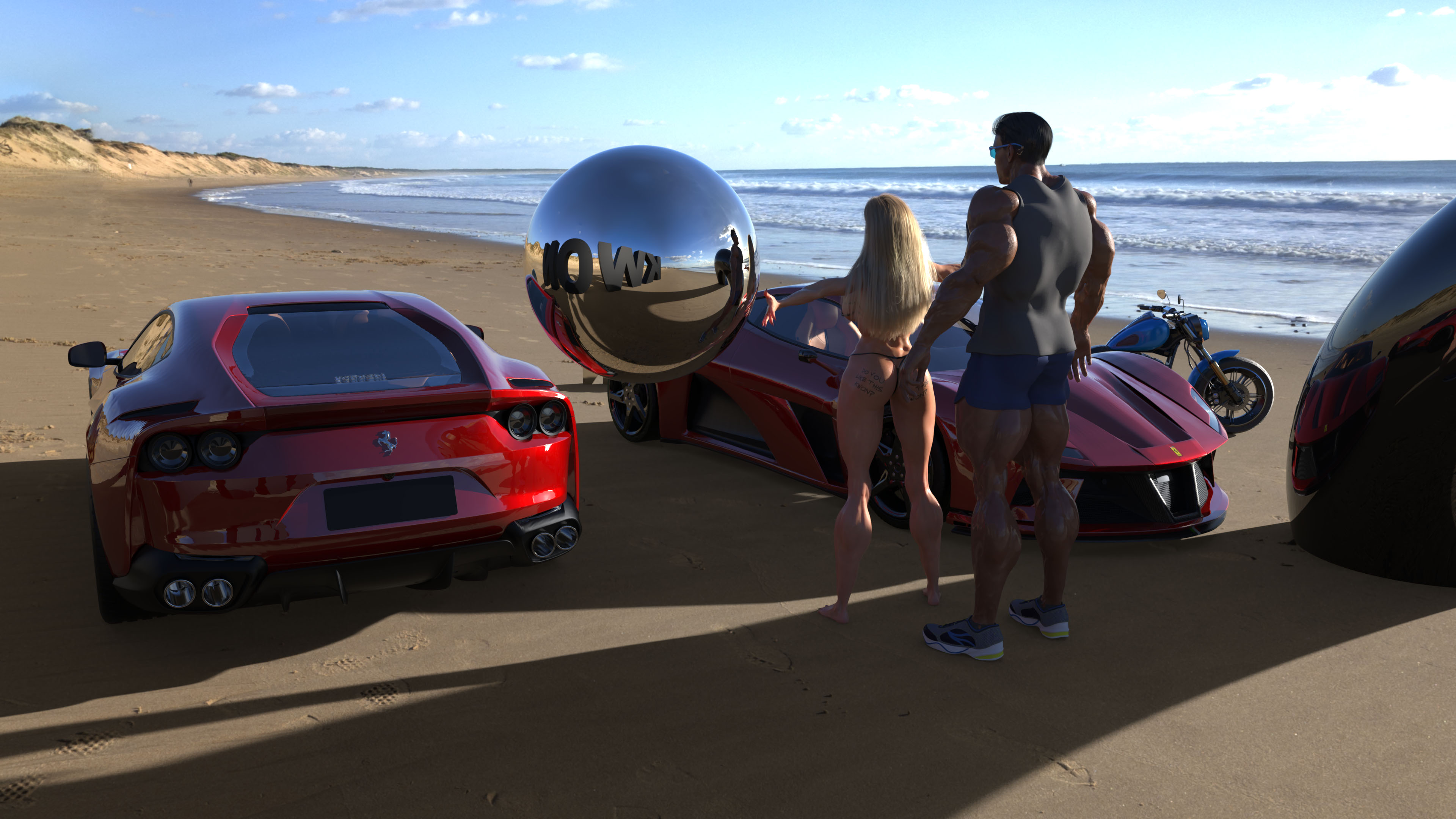 Here’s a 3D scene rendered with ray tracing. Notice the lighting - the bike’s shadows falling on the first car, and the first car’s shadows cast onto the second. Also take a look at the reflections in the spheres. These are ray-traced reflections and shadows — something AI-generated “reflections” can only fake for now and can’t accurately reproduce anytime soon.